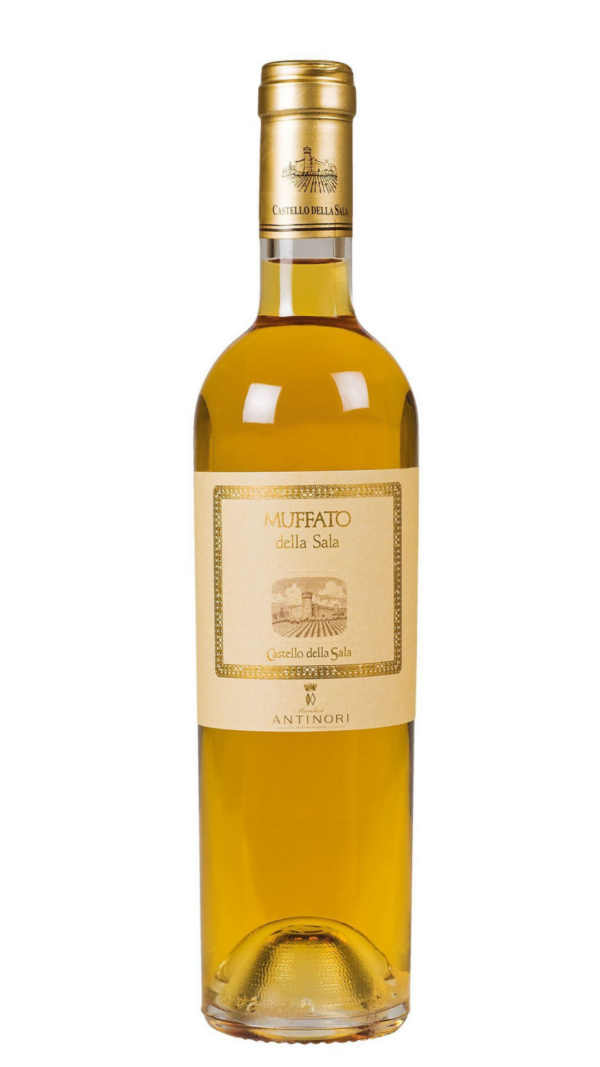 Muffato della Sala wine is a rich, golden yellow. It smells fruity with citrus and peach scents, along with saffron. When you taste it, it’s sweet but not overly so, with a bit of savory flavor. It finishes nicely and can be enjoyed now or aged for more complexity.