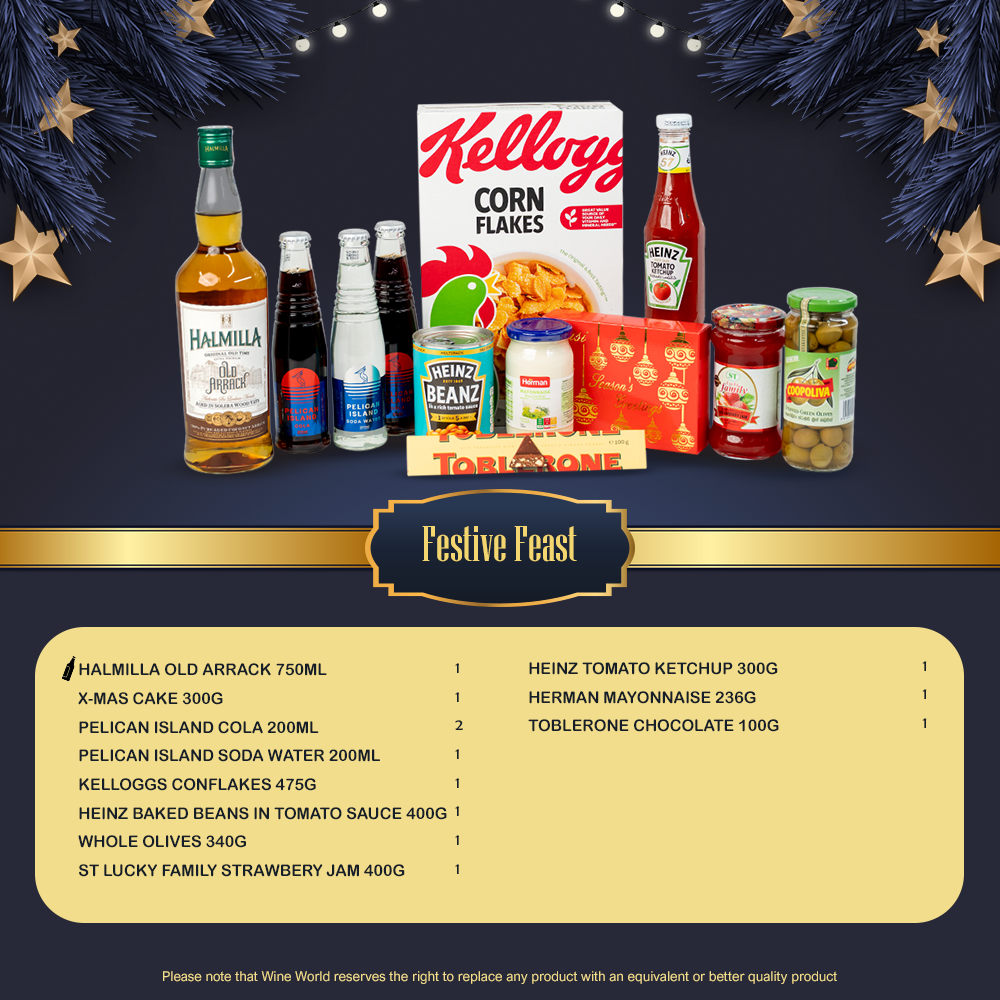 Celebrate the season with this value-packed Festive Feast Hamper, bringing together a delightful mix of holiday treats, pantry essentials, and a bottle of Halmilla Old Arrack. From Christmas cake and Toblerone to baked beans, olives, spreads, and mixers, this hamper offers everything needed for simple, heartwarming celebrations.