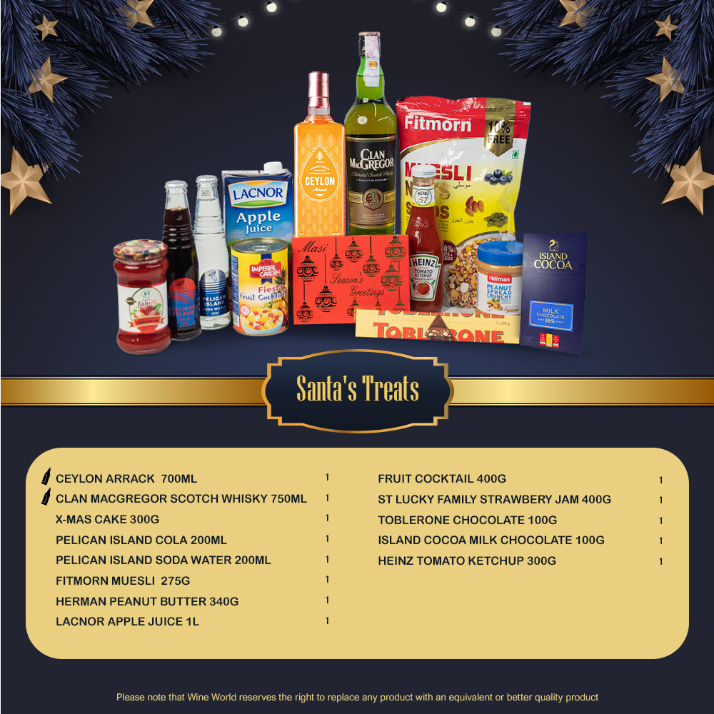 Santa’s Treats is a warm and generous festive hamper crafted for celebratory moments. With Ceylon Arrack and Clan MacGregor Scotch Whisky, it offers two classic choices for seasonal toasts. A rich X-mas cake, Toblerone, and Island Cocoa milk chocolate bring sweetness to the mix, while a selection of pantry favourites – including muesli, peanut butter, fruit cocktail, jam, ketchup, and apple juice adds variety and convenience for the holidays. With a balanced blend of festive indulgence and everyday essentials, this hamper makes a thoughtful gift for family, friends, or colleagues looking to enjoy a little extra cheer this season.