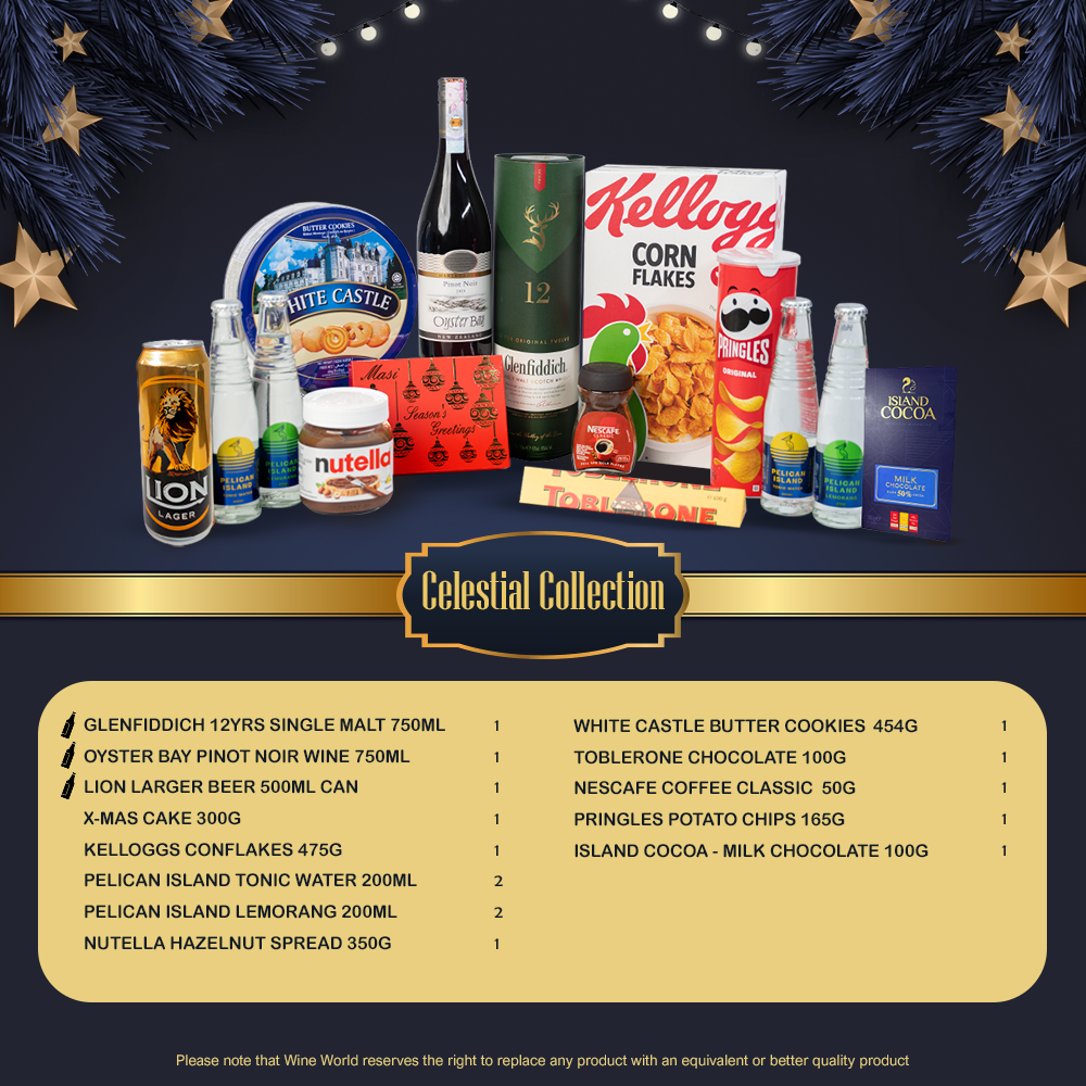 The Celestial Collection presents a refined harmony of festive favourites, led by the distinguished Glenfiddich 12 Year Old Single Malt Whisky, the elegant Oyster Bay Pinot Noir, and a touch of celebratory cheer with Lion Lager. Paired with a curated assortment of indulgences including X-mas cake, White Castle butter cookies, Nutella, premium chocolates, Nescafé, Pringles, cornflakes, and refreshing mixers, it offers a beautifully balanced blend of flavour and festivity. Thoughtfully assembled, this hamper brings together luxury, warmth, and festive abundance, making it an exceptional choice for gifting or elevating your most cherished celebrations.